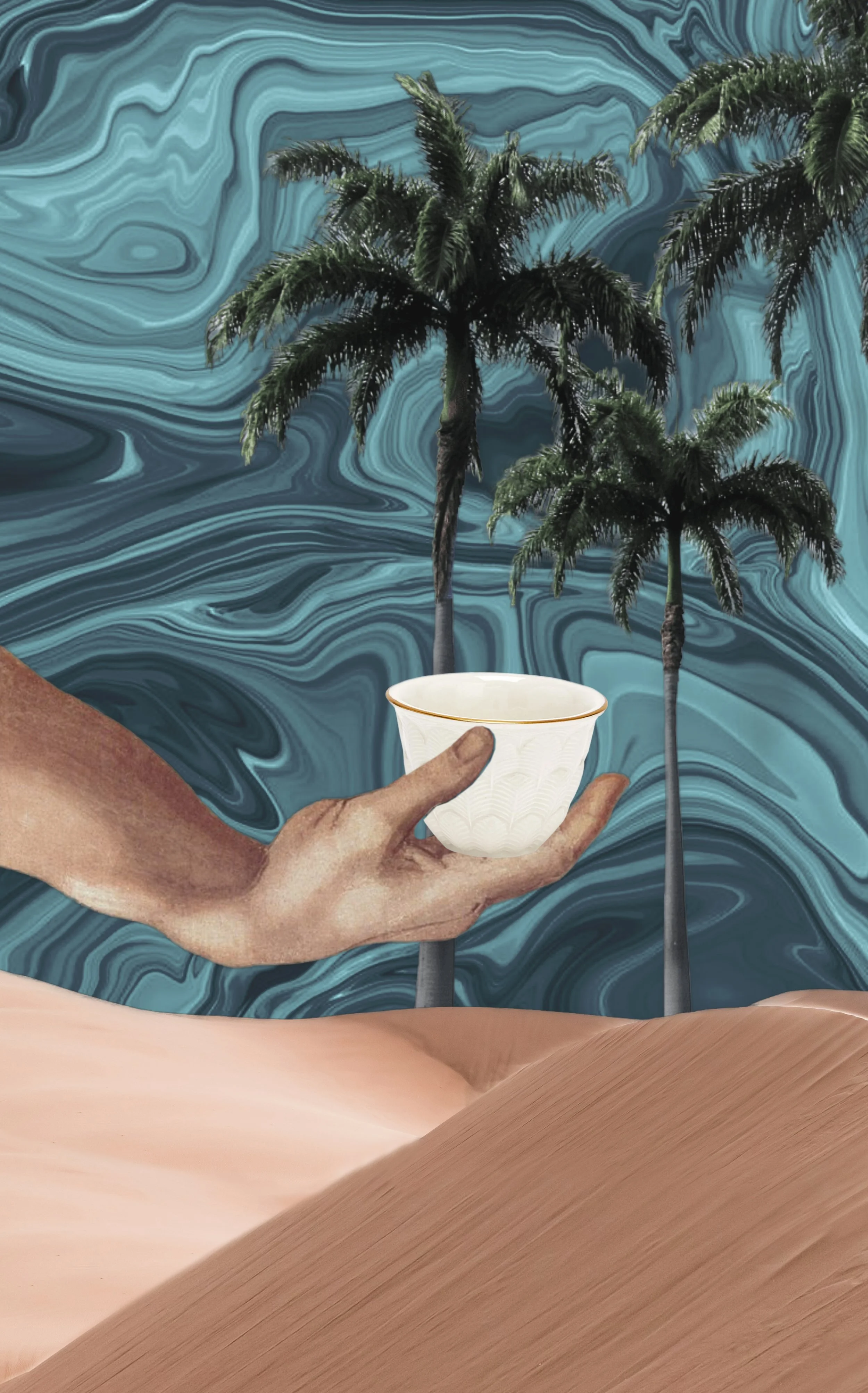 Arwa Al Shamsi’s contribution to our project at Rove Al Marjan Island features a series of framed artworks displayed in the dining area. Known for her playful, graphic approach, the artist created layered compositions that reflect the local landscape and cultural rituals. Her works incorporate textured collages inspired by Ras Al Khaimah’s natural scenery and its rich coffee and tea traditions, resulting in a collection that is both grounded and visually engaging.