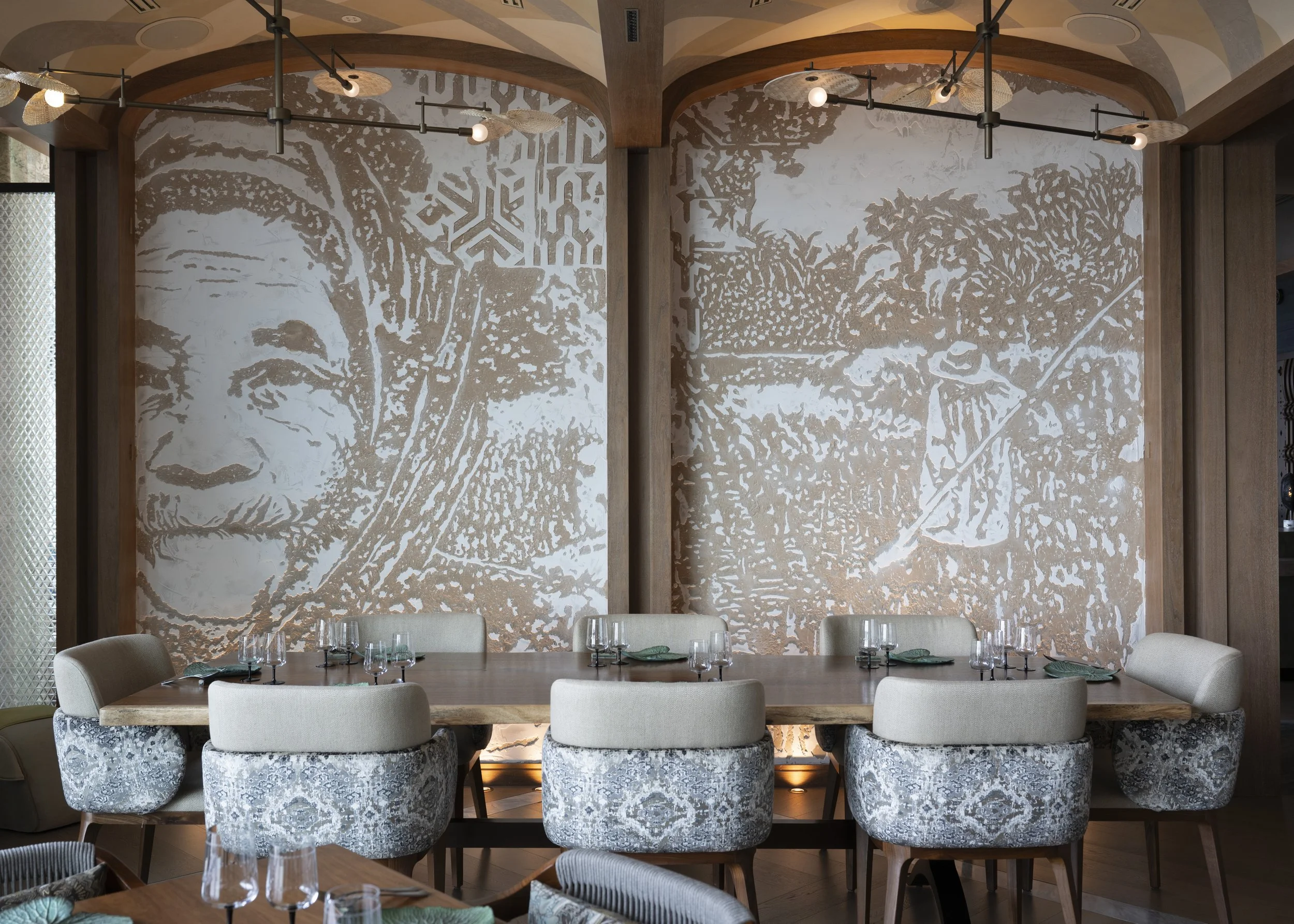 The murals in DuangDy by Bo. Lan each contains graphic patterns set against natural landscapes, while the scenes show the bustle of labour and its meditative vocation. These aspects are built upon in the artwork application. Natural clay plaster is chipped away with tools to reveal the scene, a laborious and meditative process for the solo artist Ferhat Kaz.