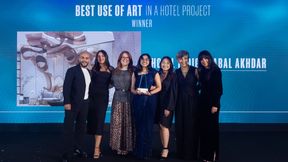 Hotel Indigo Jabal Akhdar receiving Best Use of Art in a Hotel Project at the CID Hospitality Awards 2025.